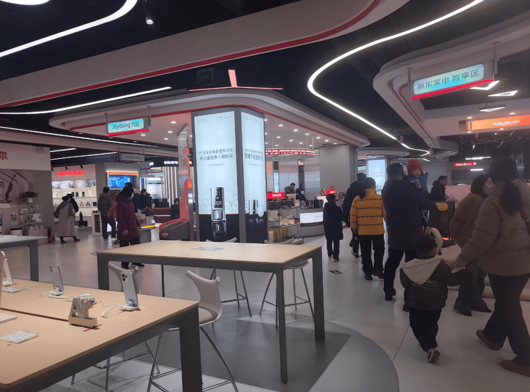 门店的空间设计同样围绕消费体验进行重构,突破传统楼层按品类分割的模式,打造“一楼精选生活,二楼焕新全家”的双层沉浸空间。一楼聚焦 3C 数码、高频居家消费品,以“新品首发站”“智能生活小场景”为主题,满足消费者即时性、轻决策的消费需求,随手体验最新款数码产品,感受智能小家电带来的生活提质;二楼整合大型家电与全屋软装,通过整屋样板间、厨房生活站等实景布局,为新房装修、旧房改造的消费者提供一站式全屋焕型解决方案,让“逛家电店像逛设计展”成为现实,真正实现了“可逛、可玩、可生活”。