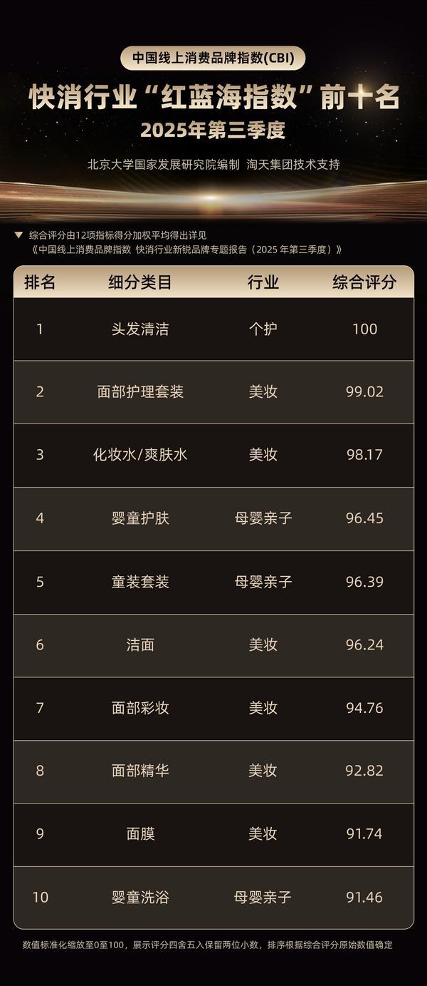 这意味着中国快消行业第一次有了可量化的赛道“红蓝海指数”。研究显示,2025年第三季度,这项“红蓝海”评分最高的五个赛道依次为:头发清洁、面部护理套装、化妆水/爽肤水、婴童护肤、童装套装。