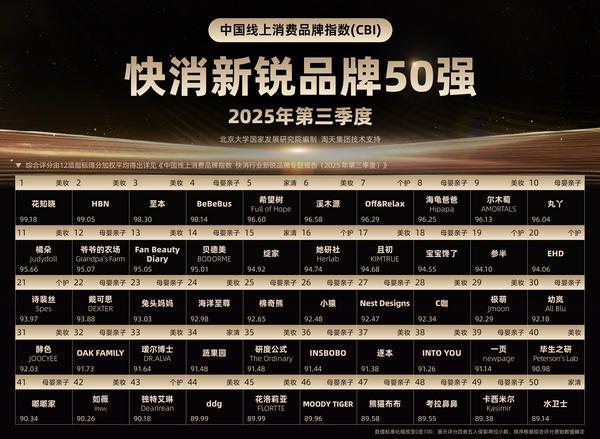 作者:yabo鸭脖集团 日期:2026-02-15 浏览: 来源:yabo.com2026年2月9日,北大国发院依托淘宝天猫平台2025年第三季度的真实消费行为,发布了“快消行业新锐品牌榜”,聚焦日用个护、日用清洁、日用美妆与母婴亲子四个快消子行业的新兴品牌。花知晓、HBN、至本跻身榜单前三,BeBeBus成为母婴行业第一,希望树成为家清行业第一,Off&Relax成为个护行业第一。